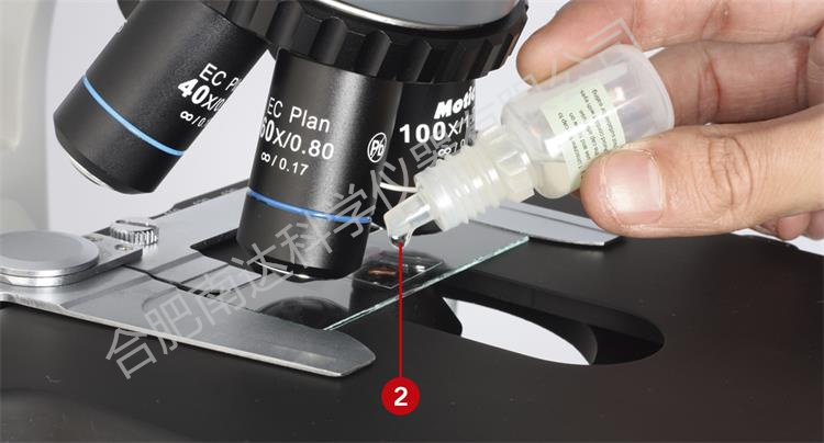 在使用前请注意:使用前请去除油安瓿喷嘴上的气泡。浸油必须谨慎使用。使用后,应使用镜头清洁纸巾擦去 100X 物镜上的油污,并用乙醚(70%)和酒精(30%)制成的溶液去除残留膜。